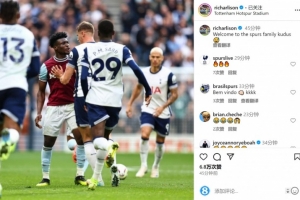 理查利森社媒晒库杜斯与热刺冲突照片:欢迎加入热刺大家庭 xiaoqiao 2025年09月14日 14:41 145 0 体育资讯7月11日讯 热刺官方宣布签下西汉姆边锋库杜斯,转会费5500万英镑,双方签约6年。 热刺前锋理查利森更新社媒动态,晒出库杜斯与热刺球员在球场上发生冲突的照片,配文:“欢迎加入热刺大家庭,库杜斯😅”